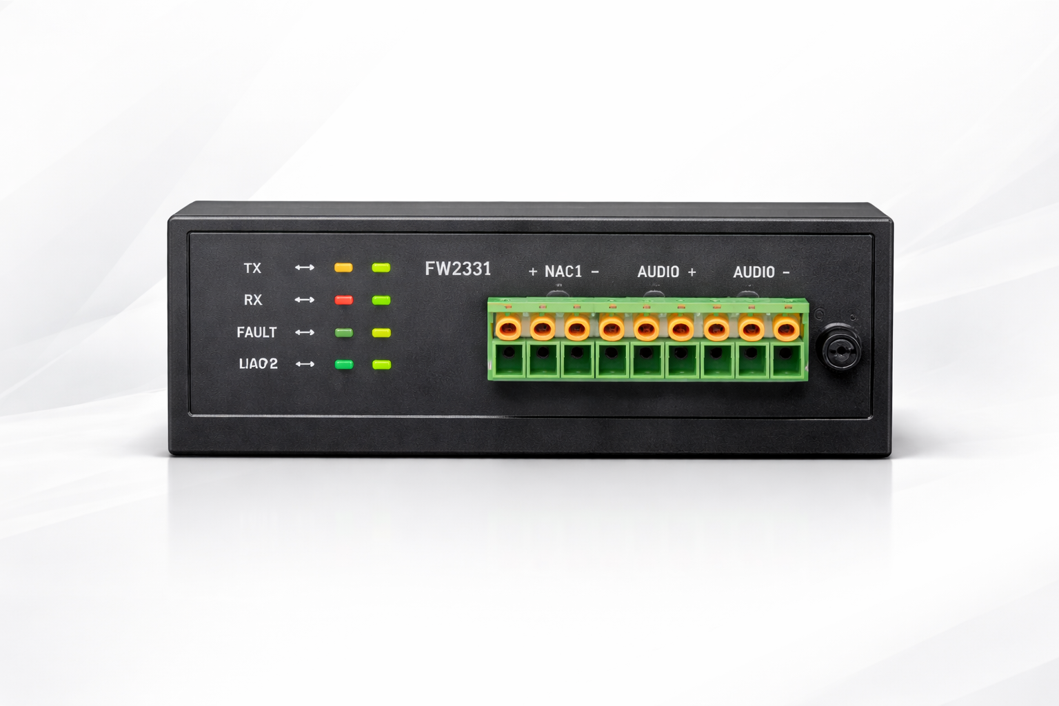 The FW2331 NOU (Notification Output Unit) provides intelligent output expansion for fire alarm notification appliance circuits. It enables system scalability and supports additional audio/visual notification devices.